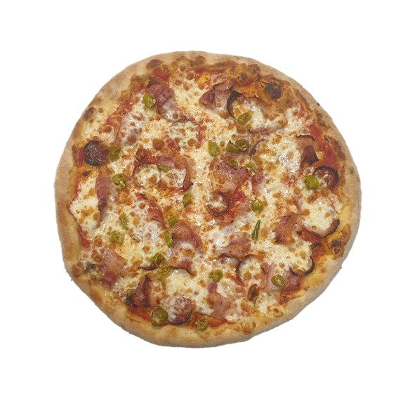 Blat pizza, sos roșu, bacon, cârnați, mozzarella Fiori di Latte, ardei murat picant.