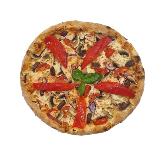 Blat pizza, sos roșu, mozzarella Fiori di Latte, roșii cherry, măsline Kalamata, ardei copți, ciuperci, busuioc verde