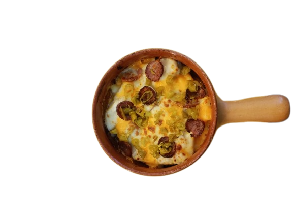 cartofi prajiti*gratinati,smantana de gatit,cheddar,ardei iute murat,carnati,mozzarella