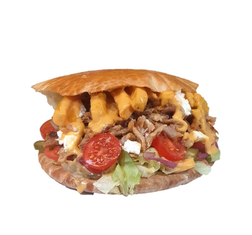 pita, sos de maioneza cu usturoi, sos hamburger, salata eisberg, castraveti murati, crema de branza, cartofi prajiti, ceapa rosie, rosii cherry, carne doner